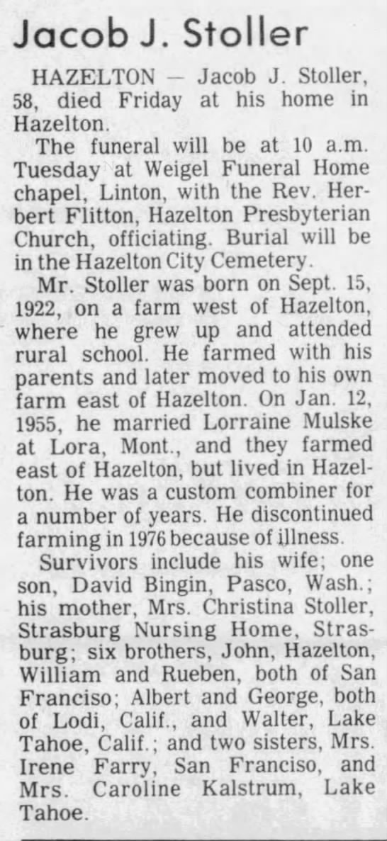 Jake hauled rock for Schoonover Bros. Const. when the bridge was rebuilt across the Missouri at Bismarck; he also worked in Medora.  Jake did custom combining with his cousin, Hilbert Stoller, for about 20 years, from Enid, OK and back to ND.  He quit in 1073 and sold his land in 1076, due to failing health.