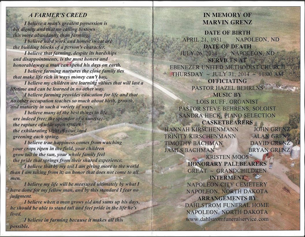 The funeral for Florence Grenz, Napoleon, ND will be Thursday, April 5, 2018 at 11:00 am at United Methodist Church at Streeter, ND.  Visitation will be Wednesday from 4:00 pm to 8:00 pm at Dahlstrom Funeral Home in Napoleon, ND.  Burial will be at the Napoleon City Cemetery, Napoleon, ND.