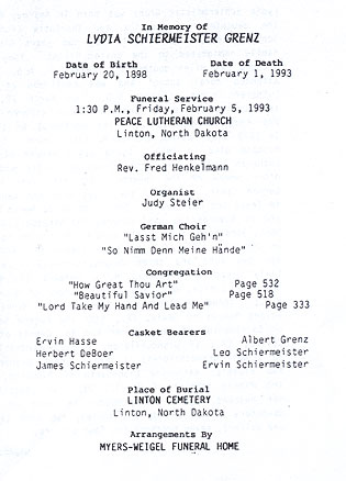 Lydia Schiermister Grenz was born in Ananov, Russia, the daughter of Fredrick and Sharlotta (Fuhrmann) Schiermeister.  When Lydia was two years old, her family immigrated to the United States.  They homesteaded 12 !/2 miles southwest of Hazelton, N.D.  Lydia attended rural school and was confirmed at Peace Lutheran Church, Linton, N.D.  On March 20, 1919 she married Godfrey C. Grenz at Peace Lutheran Church and they homesteaded 22 miles northwest of Linton.  In 1975 they retired and moved into Linton.  Lydia's husband died in 1979.  Lydia was a member of Pease Lutheran Church and enjoyed making quilts with the German Choir.  In 1987 she lived with her daughters in Texas and California.  She returned to North Dakota and on November 9, 1991 entered the Strasburg Nursing Home. Strasburg, N.D.  Lydia died at the Linton Hospital on Monday.  Grateful to have shared her life are Sally Grenz of Braddock, N.D., Herbert and Arlene Grenz of Linton, N.D. and Dorothy Grenz of Bismarck, N.D.;  three daughters and sons-in-law:  Minnie and Roland Duncan of Sealy, TX., Anna and Eugene Schmidt of Sacramento, CA. and Esther and Ray Dennis of West Covina, CA.; 17 Grandchildren; 5 step-Grandchildren; 33 Great Grandchildren; 1 Great Great Grandchild; Two sisters; Katherine Eisenbarth of Bismarck, N.D. and Minnie Schmidt of Powell, WY.  In addition to her husband, Lydia was preceded in death by three daughters (Alma, Frieda and Rosie), two sons (Edward and Walter), seven brothers and four sisters.