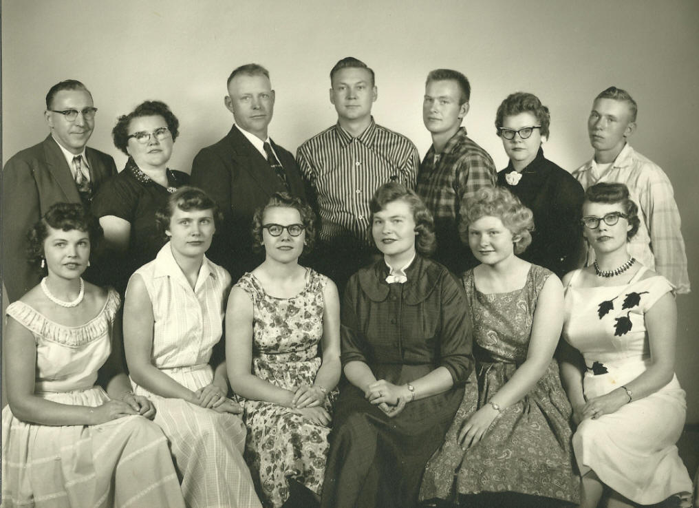 Top:  Jake, Tillie, Ed, Fred, Wally, Edna, Dickie     Front:   Ruth, Annitha, Helen, Helen, Irene, Annie, Mathilda ----- August, 1958