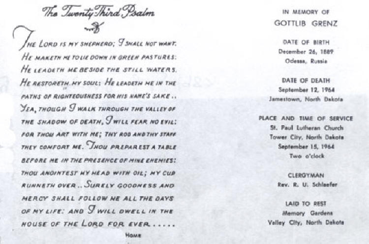 Gottlieb Grenz was born 28 Dec. 1890 at Guldendorf, Russia, according to the Naturalization Papers filed by his father, Gottlieb Grenz.  he emigrated to the U.S. with his parents and 9 brothers and sisters aboard the SS Noordland, which sailed from Liverpool, England on Nov. 29, 1905 and landed at the Port of Philadelphia on 13 Dec. 1905.