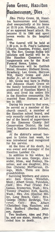 John P. Grenz was born March 20, 1910, and died April 14, 1969.  He was the son of Phillip and Johanna (Kast) Grenz.  Rose Humann was born Aug 5, 1909 and died June 7, 1997.  She was the daughter of Henry and Margaretha (Schiermeister) Humann.  John and Rose were married Nov 29, 1933 in Linton at the Lutheran Church parsonage.  They moved to a farm six miles west of Hazelton.  In the summer of 1938 they added another farm with better buildings.   They moved there to make their home .  Over the years they improved the farm with new garages, granaries, machine shed and a new house.  John and Rose sold the farm to their son Rodney June 1967 and moved into Hazelton.  They had 3 children.