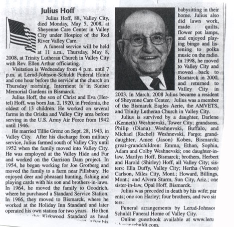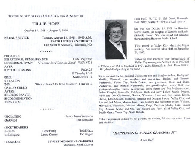 Tillie stayed at her Grandmother Louisa (Gabert) Schock's home in Wishek to take care of her, when Tillie was 15 years old.  Tillie stayed there until her grandmother died in Aug. 1939; Tillie was almost 18 by then, and her parents had moved to Tower City, ND.  although she moved back home, she soon hired out to do housework at various farms in the area until she married Julius Hoff in 1943.
