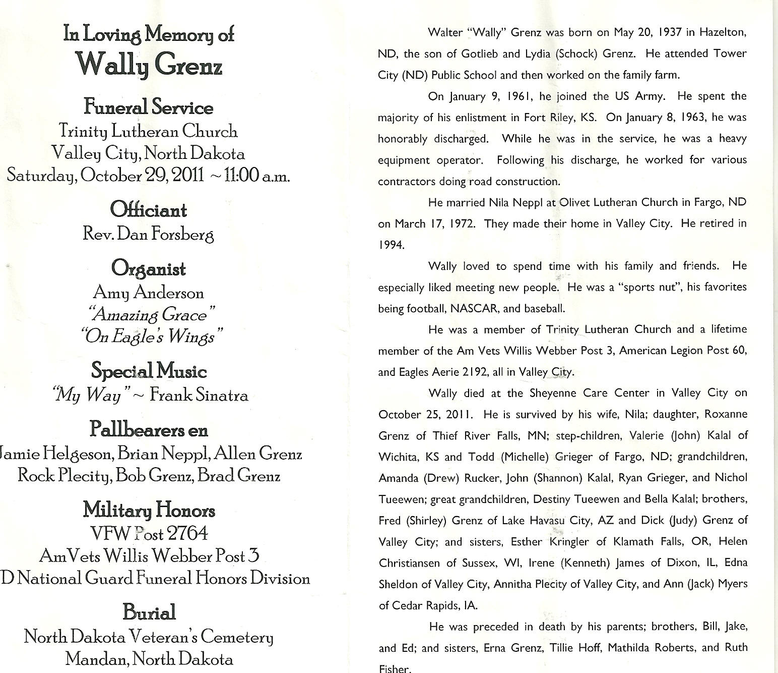 The memorial service for Nila will be 3 p.m. Saturday, August 31, 2013, at the Oliver-Nathan Funeral Chapel, Valley City, with Rev. Dan Forsberg officiating.  Inurnment will be in the North Dakota Veterans Cemetery.
