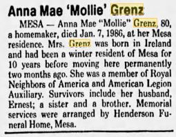 May (Mollie) died January 5, 1986 in Mesa, Arizona. She was