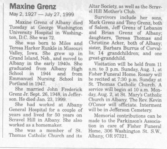 Mr. Grenz was born Oct. 25, 1925, in Albany. He was born on Scravel Hill, near Albany, and lived in that area all of his life. He went to work in 1947 for the U.S. Postal Service. He was a rural mail carrier and retired in 1983. He married his wife Maxine in 1948.
